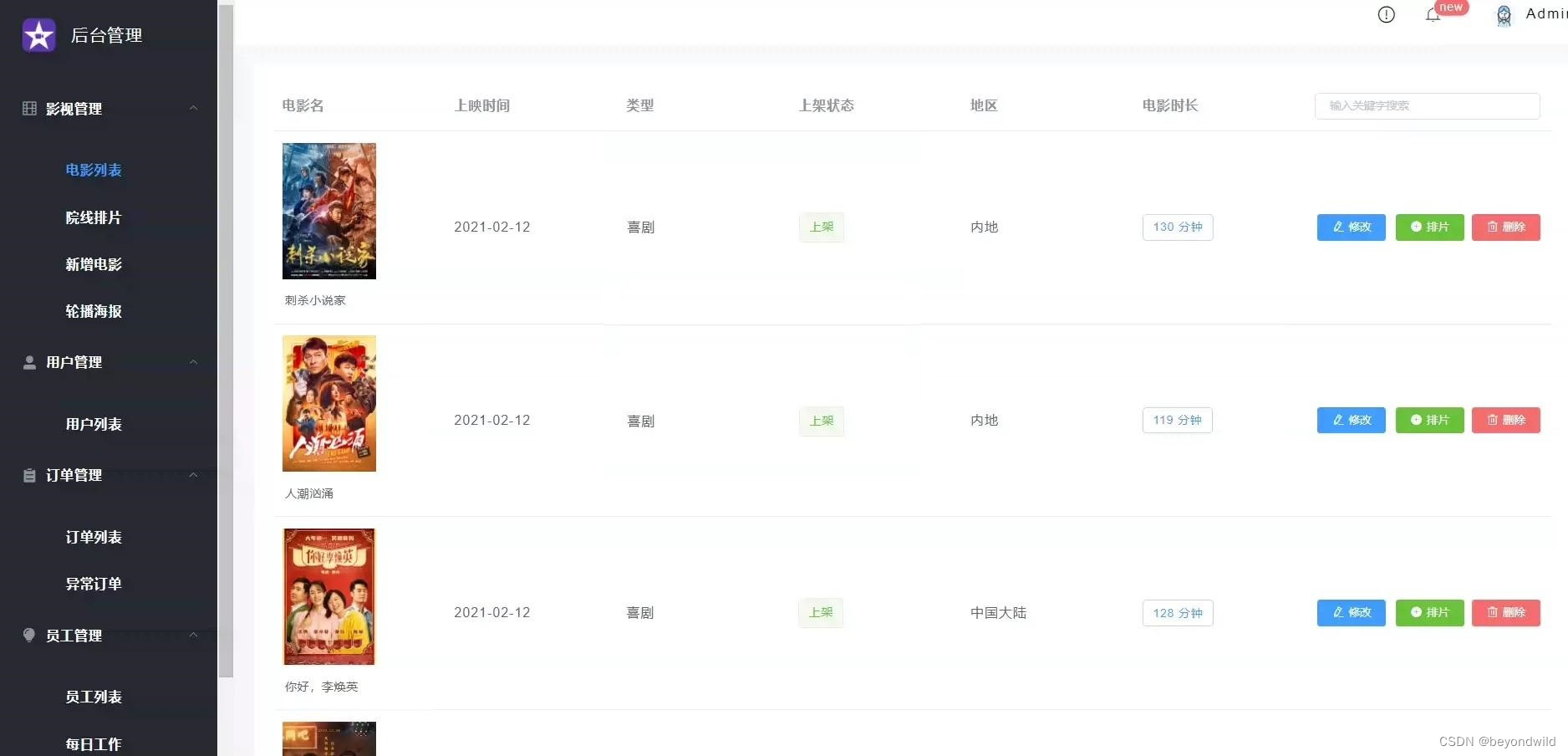 后台管理介绍(影视管理、电影列表、院线拍片、新增电影、轮播海报、用户管理、用户列表、订单管理、订单列表、异常订单、员工管理、员工列表、每日工作):