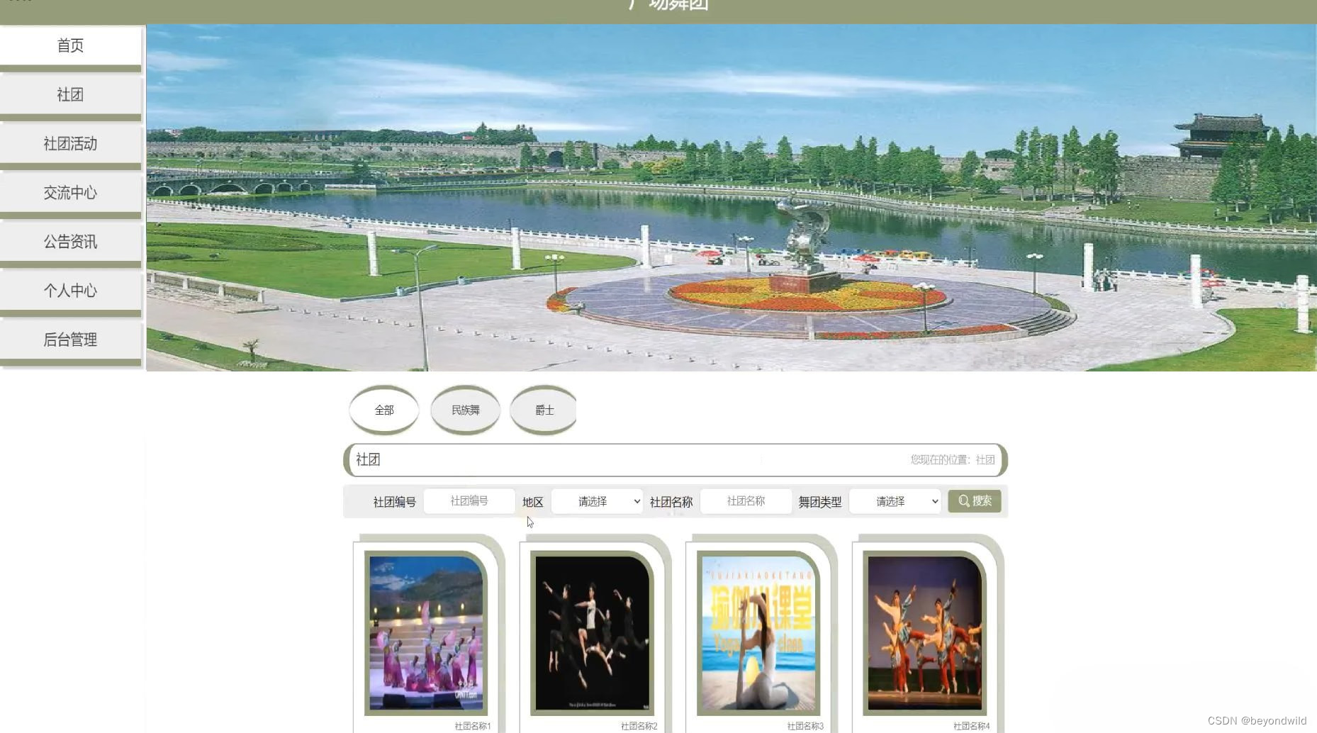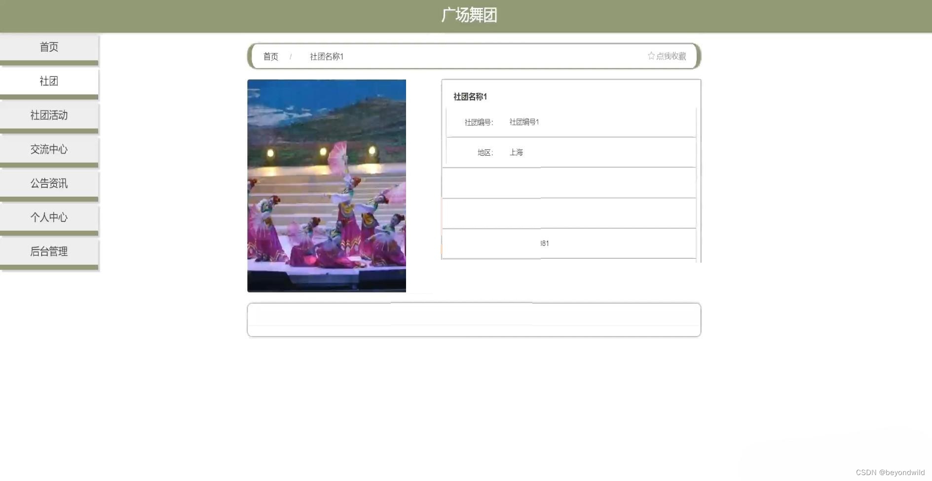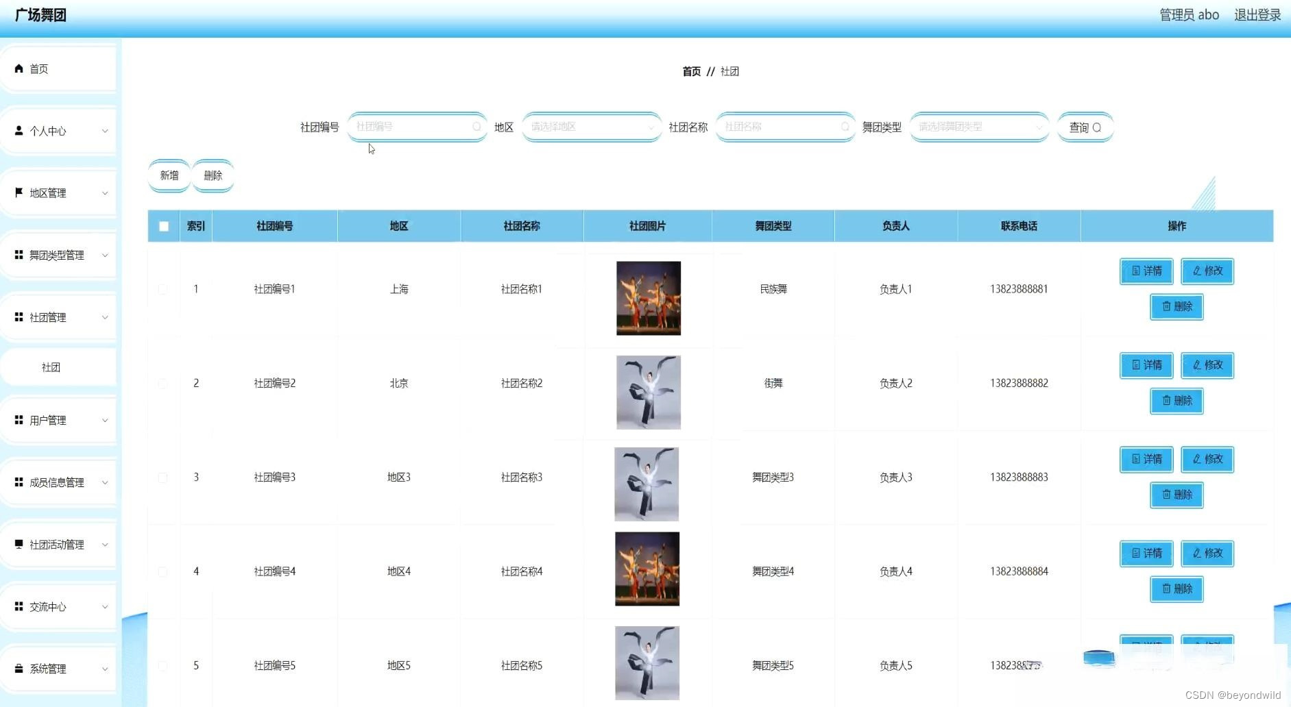 管理员:管理员登陆系统后,可以查看首页,个人中心,地区管理,舞团类型管理,社团管理,用户管理,成员信息管理,社团活动管理,交流中心,系统管理等功能等功能,还能对每个功能逐一进行相应操作,