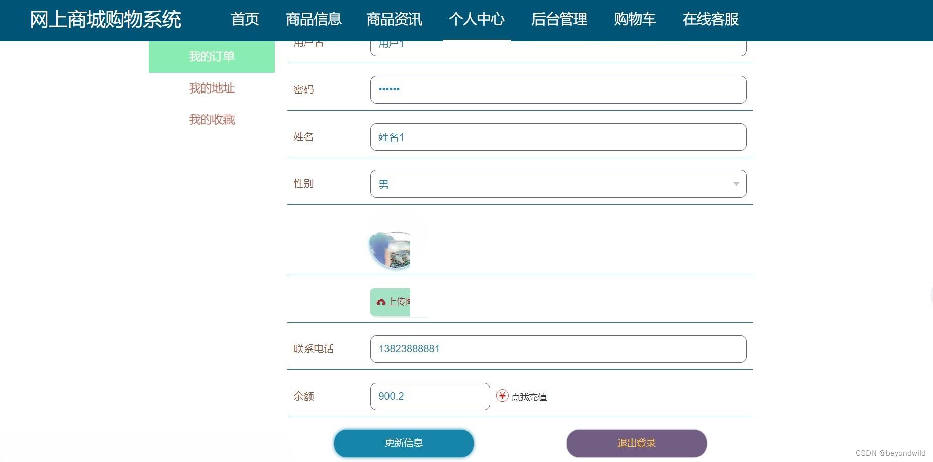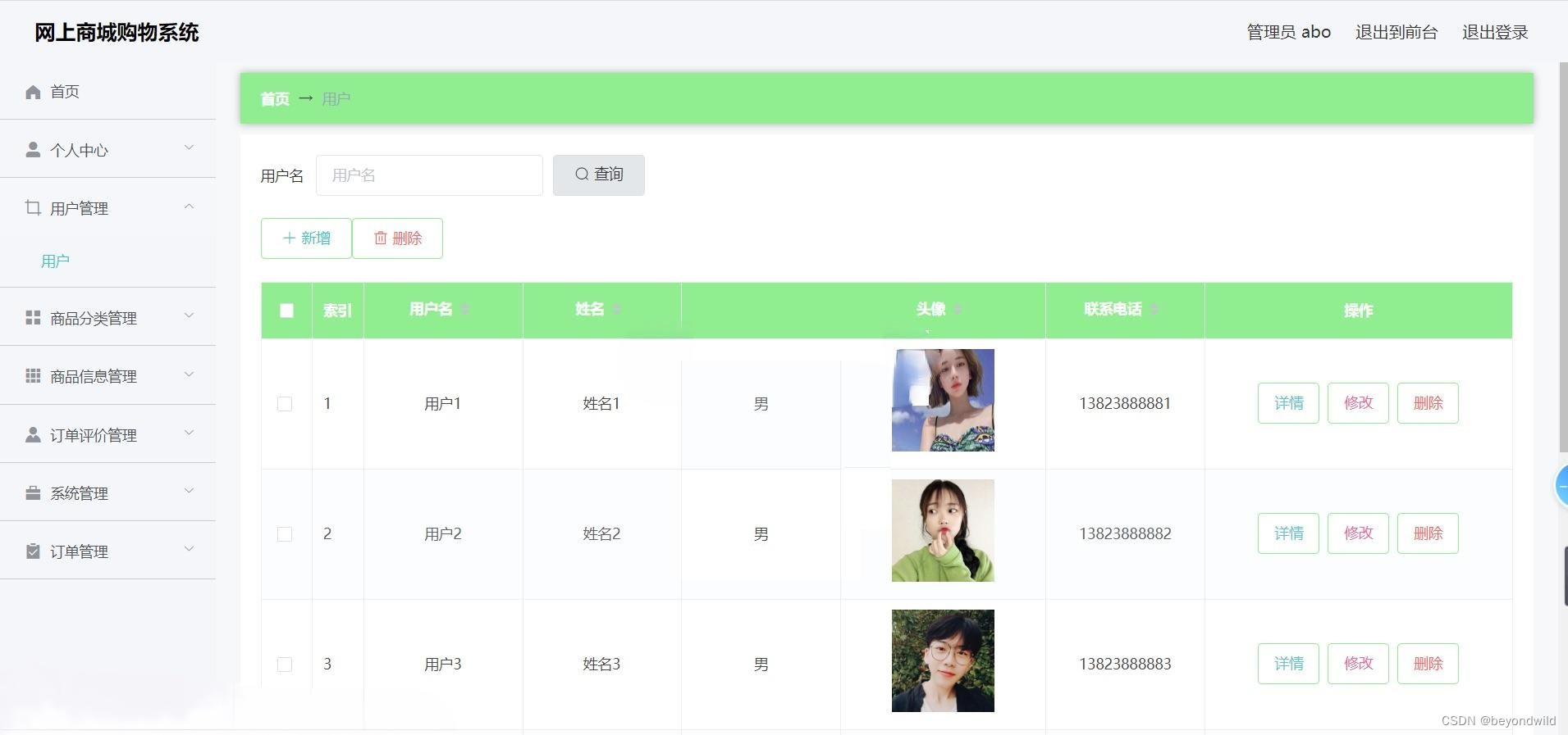 管理员:首页、个人中心、用户管理、分类管理、商品信息管理、订单评价管理、系统管理、订单管理