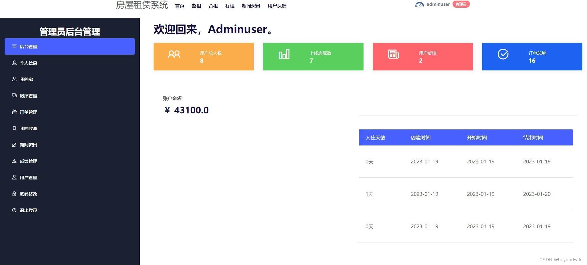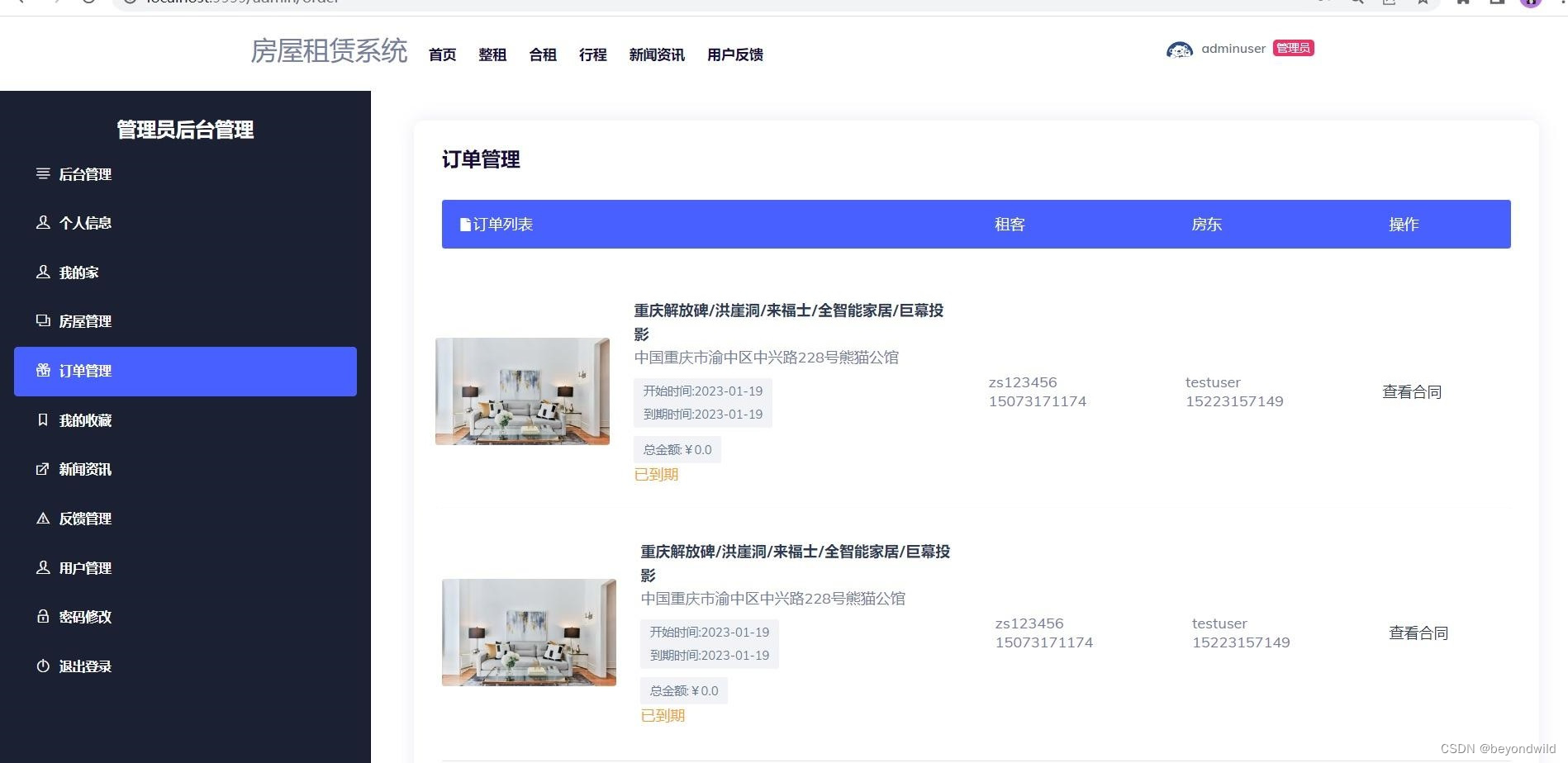 后台功能模块: 用户端:订单管理+个人信息+我的家+我的收藏+密码修改+我的反馈 管理员端:房子管理+订单管理+新闻资讯管理+反馈管理+用户管理+个人信息+我的收藏+密码修改 房东端:房子管理+订单管理+个人信息+我的收藏+密码修改+我的反馈