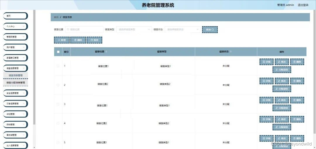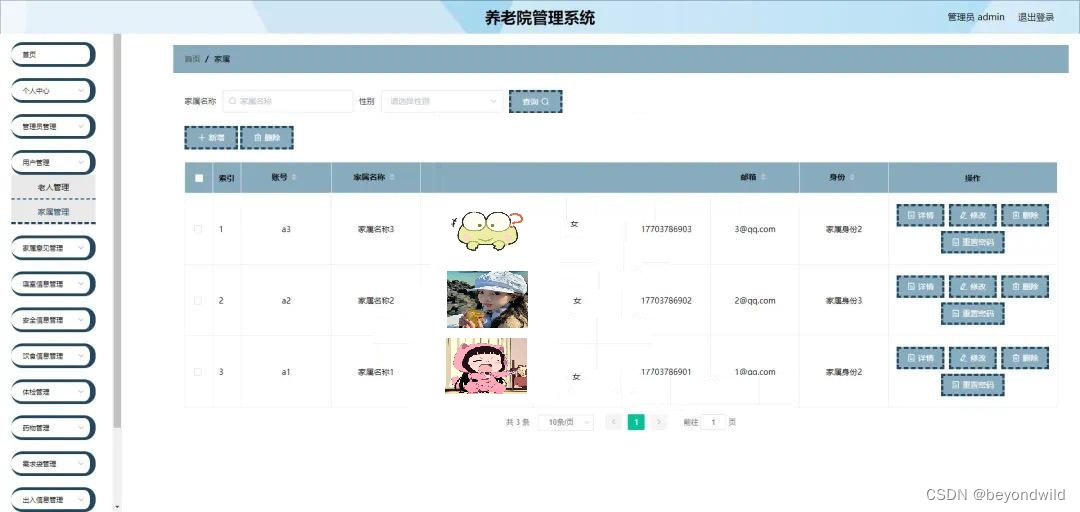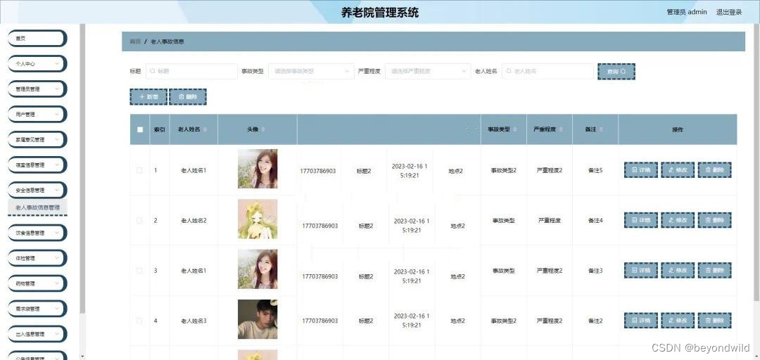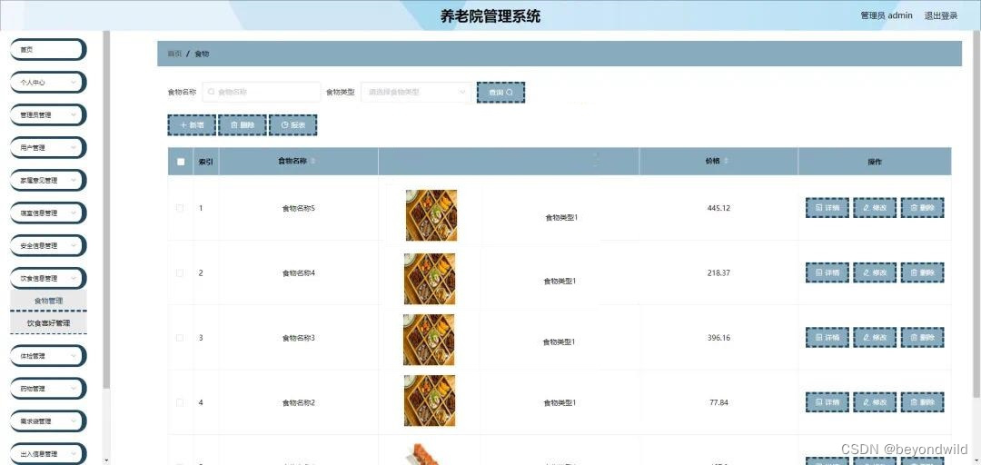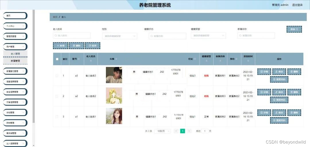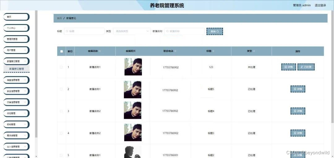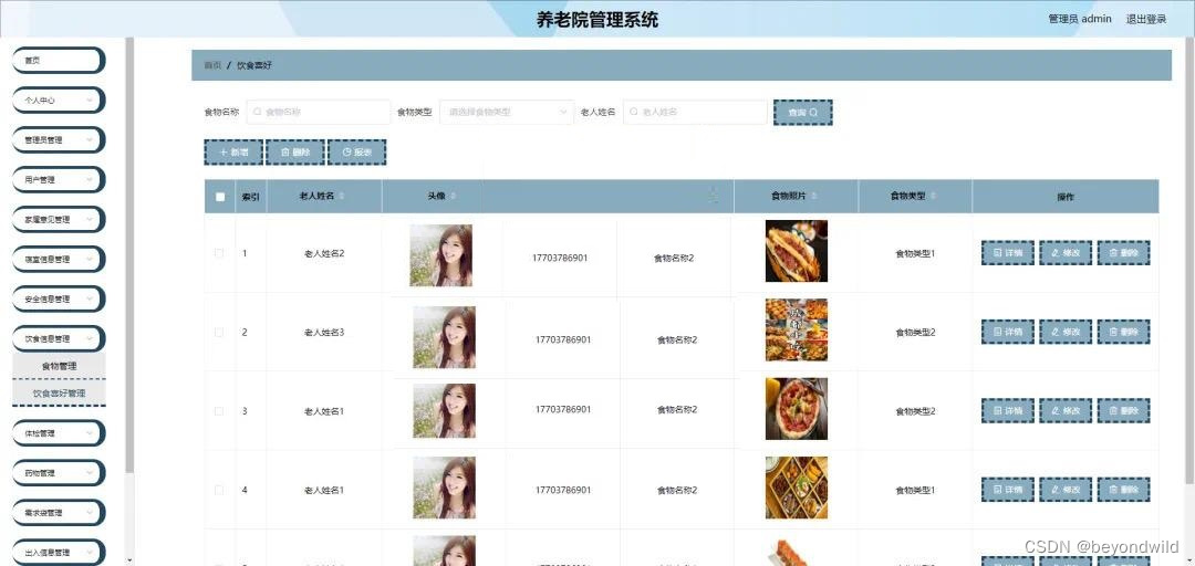 系统包含登录、注册、主页、老人管理、家属管理、家属意见管理、寝室管理、老人事故信息管理、食物管理、饮食喜好管理、体检管理、药物管理、老人外出信息管理、访客信息管理、公告信息管理、基础数据管理等功能模块。