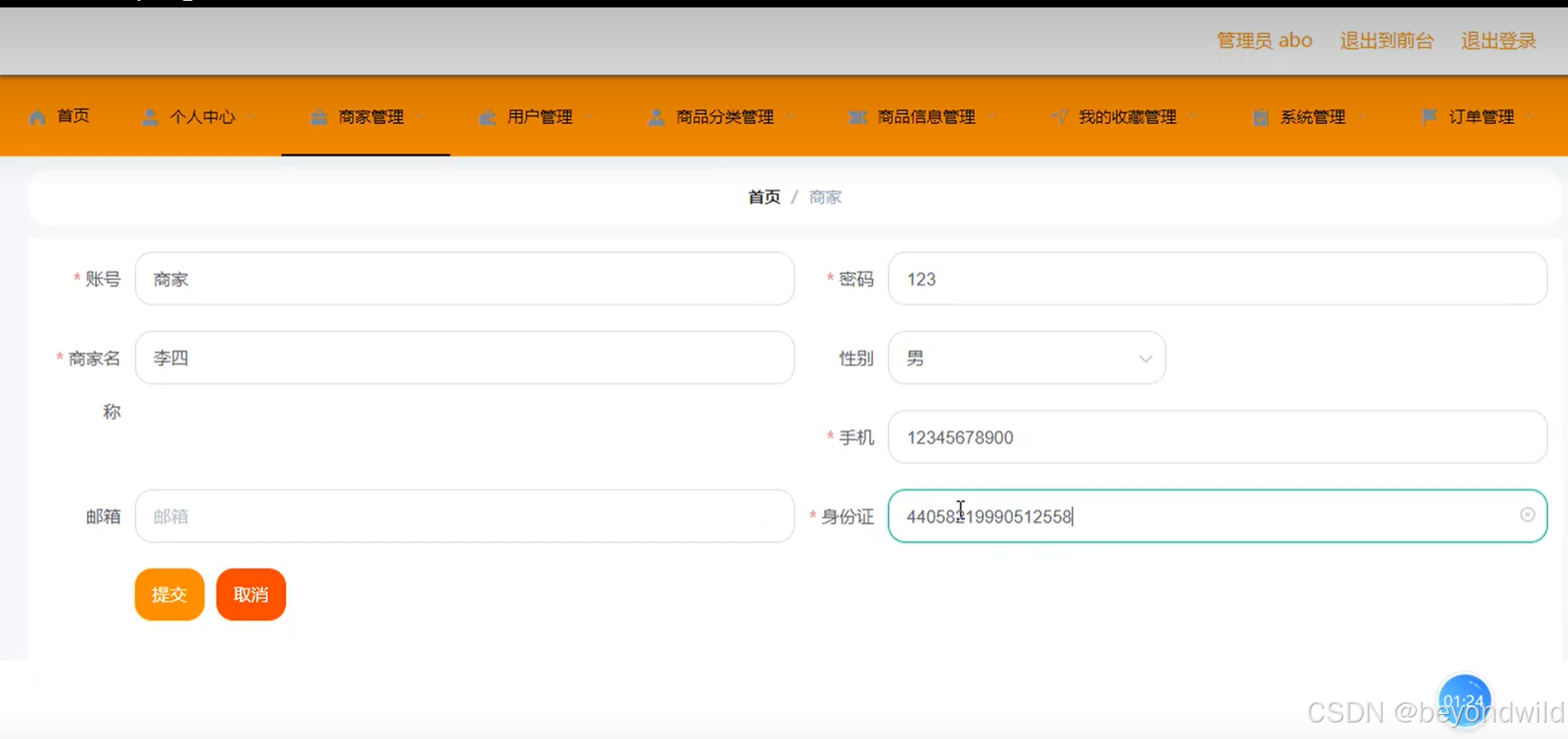 后台管理员主要功能:首页、个人中心、商家管理、用户管理、商品分类管理、商品信息管理、我的收藏管理、系统管理、订单管理等。