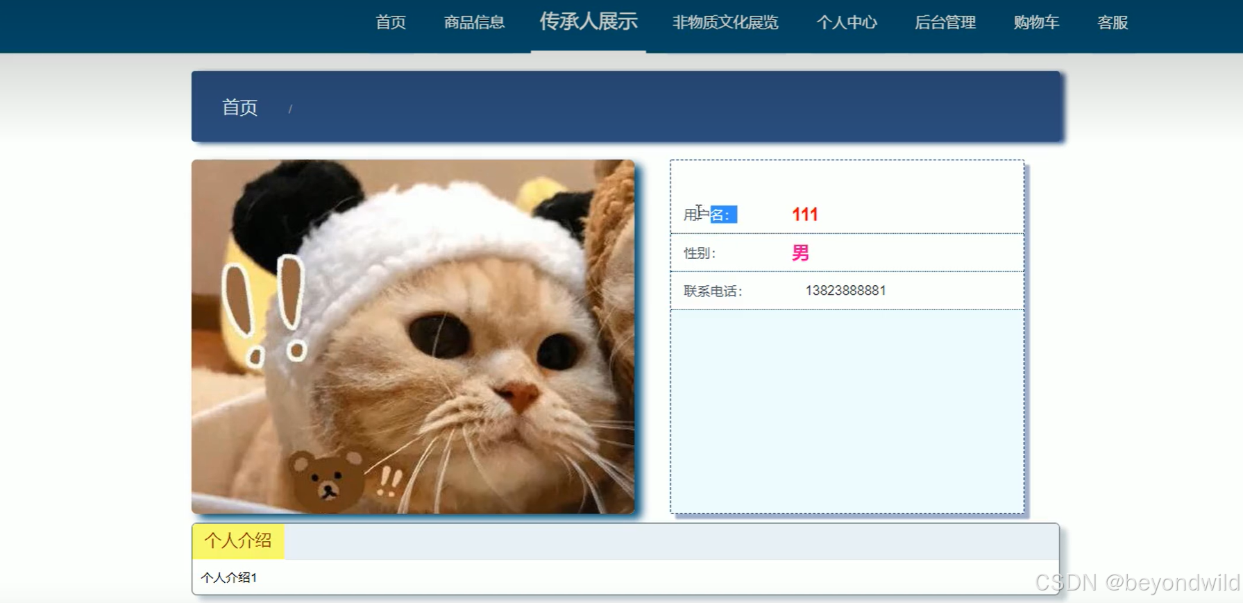 前台主要功能:首页、商品信息、传承人展示、非物质文化展览、用户个人中心、我的订单、我的地址、我的收藏、购物车、客服等功能;