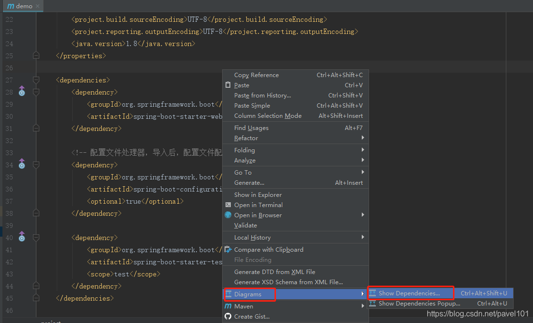 先在pom.xml文件上右键-->diagrams-->show dependencies打开依赖关系图