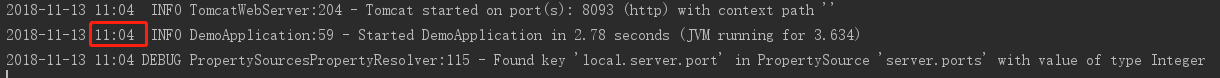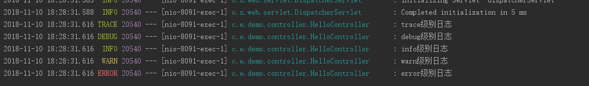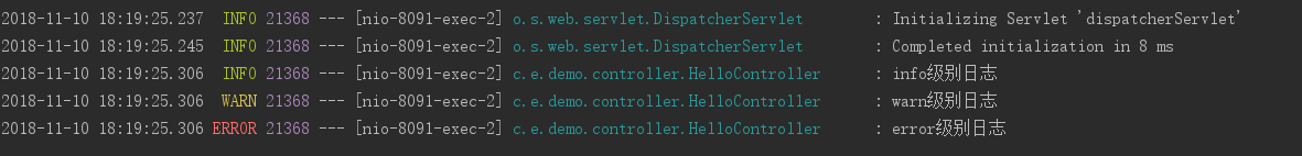 只输出info, warn, error级别的日志,这说明spring boot 的默认日志级别是info。