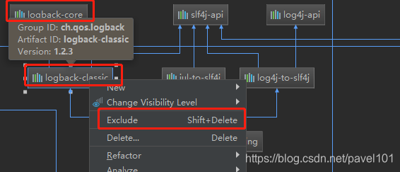 找到logback-classic和logback-core分别右键Exclude,排除掉这两个依赖,因为slf4j同时只能有一个实现,我们要使用log4j实现就必须先排除logback,不然会报错,冲突。