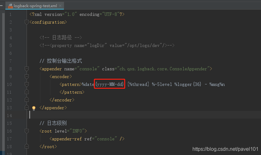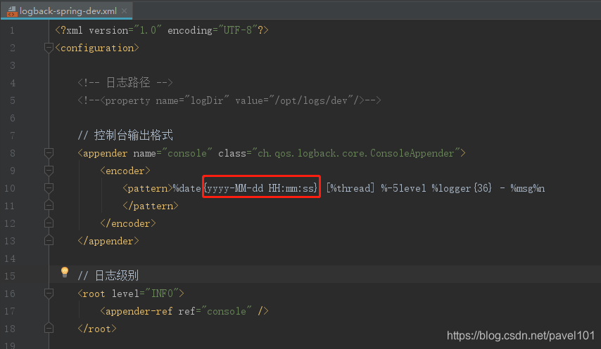然后写上一些内容,这里先配置简单一些,做个测试,将dev环境的日志输出时间格式设置为:年月日时分秒