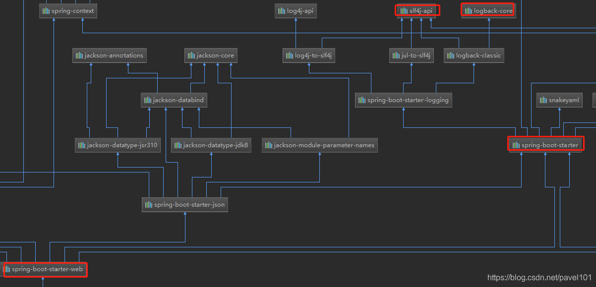 默认的日志实现的jar都已经封装好了,在spring-boot-starter.jar包中,这个前面讲过,springboot中会有一系列的spring-boot-starter开头的jar包(场景启动器),适用于不同的场景,而spring-boot-starter包就是所有的starter的父依赖,所以你导入任何一个场景启动器,默认的日志实现就导入进来了。