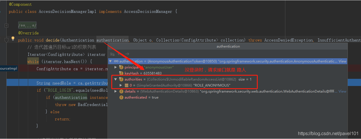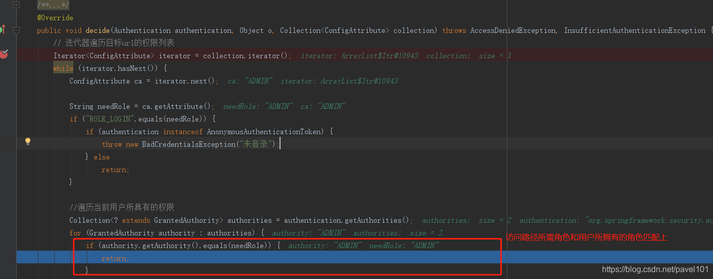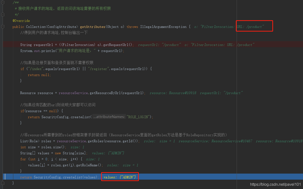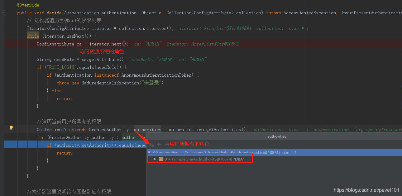 再往下就到AccessDecisionManagerImpl类中进行角色匹配,若匹配上,访问product成功,若没有匹配上,返回权限不足。