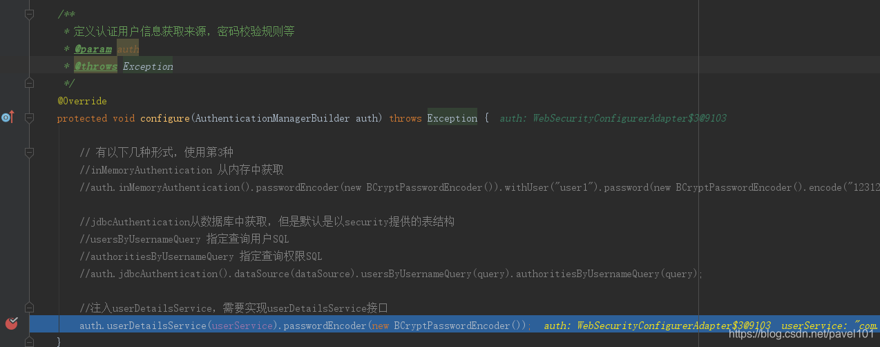 会先访问安全配置类的中的configure方法,定义用户认证信息的获取来源以及密码校验规则,