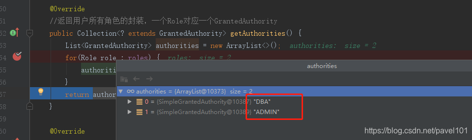 这个是调用的UserDetailsImpl类的构造函数进行返回,返回的结果就是用户的相关信息,包括用户名,密码,以及用户所拥有的角色,如下,进入到UserDetailsImpl类中getAuthorities()方法进行用户的角色封装