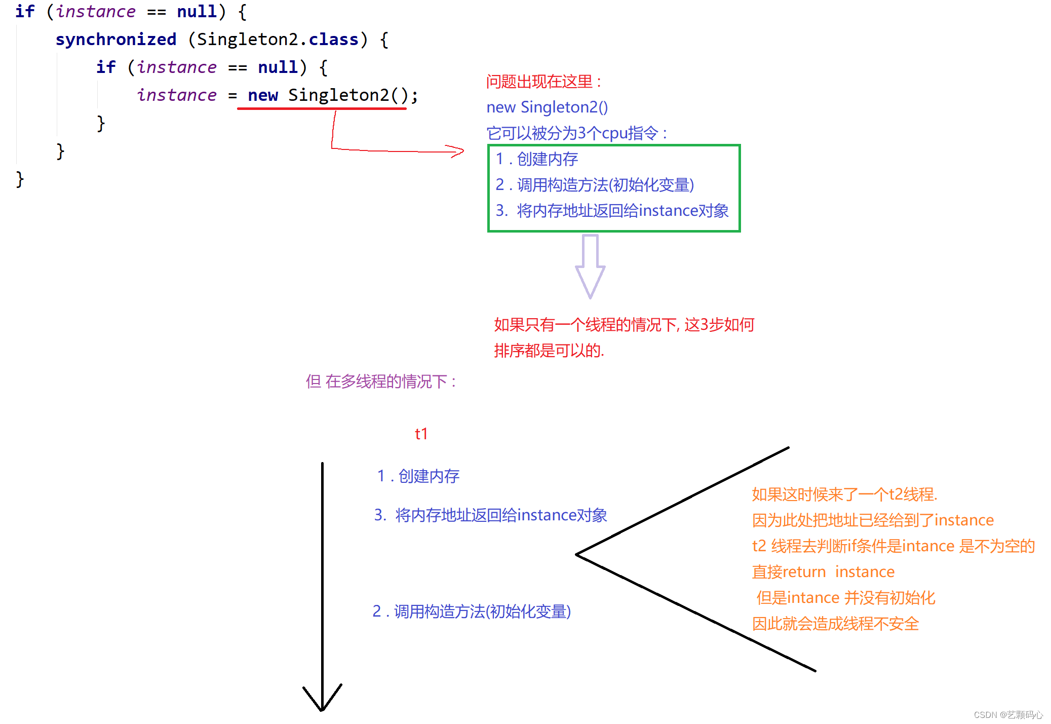 换个思考方向 : 因为instance 只需要被创建一次 , 加锁针对的是在instance == null 的情况下,多个线程同一时间执行 , 以防创建出多个对象 , 等instance创建出来之后 , 锁竞争还是存在,这样就影响了程序的执行效率, 后面的线程想要获得instance 对象 , 都要进行加锁解锁操作, 这是没有必要的, 因为instance 早已经创建出来了.