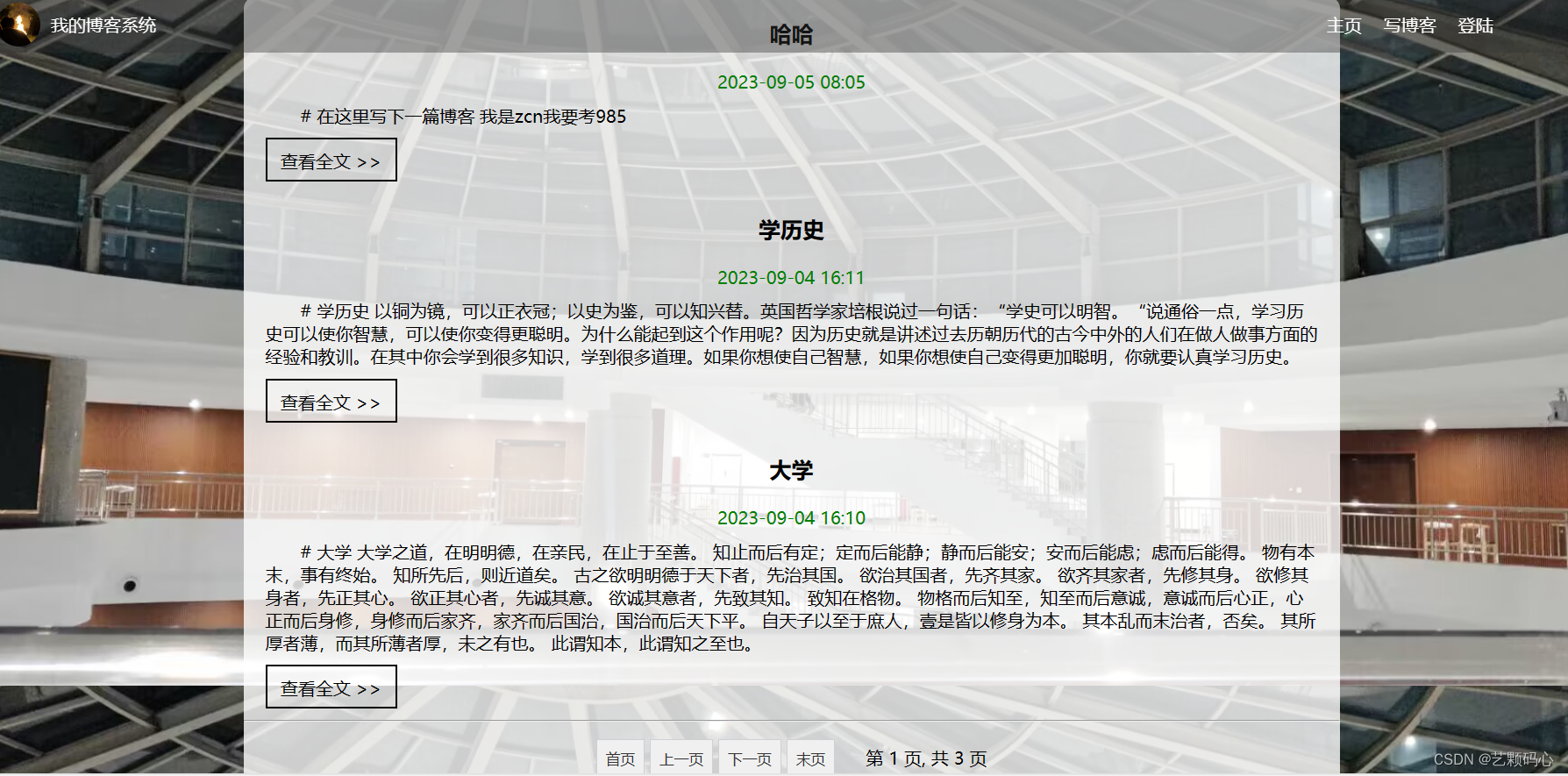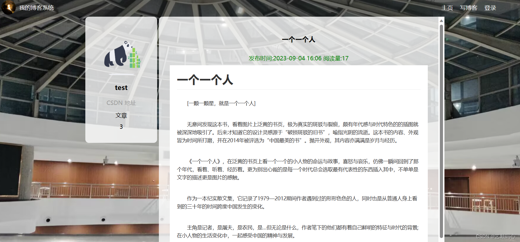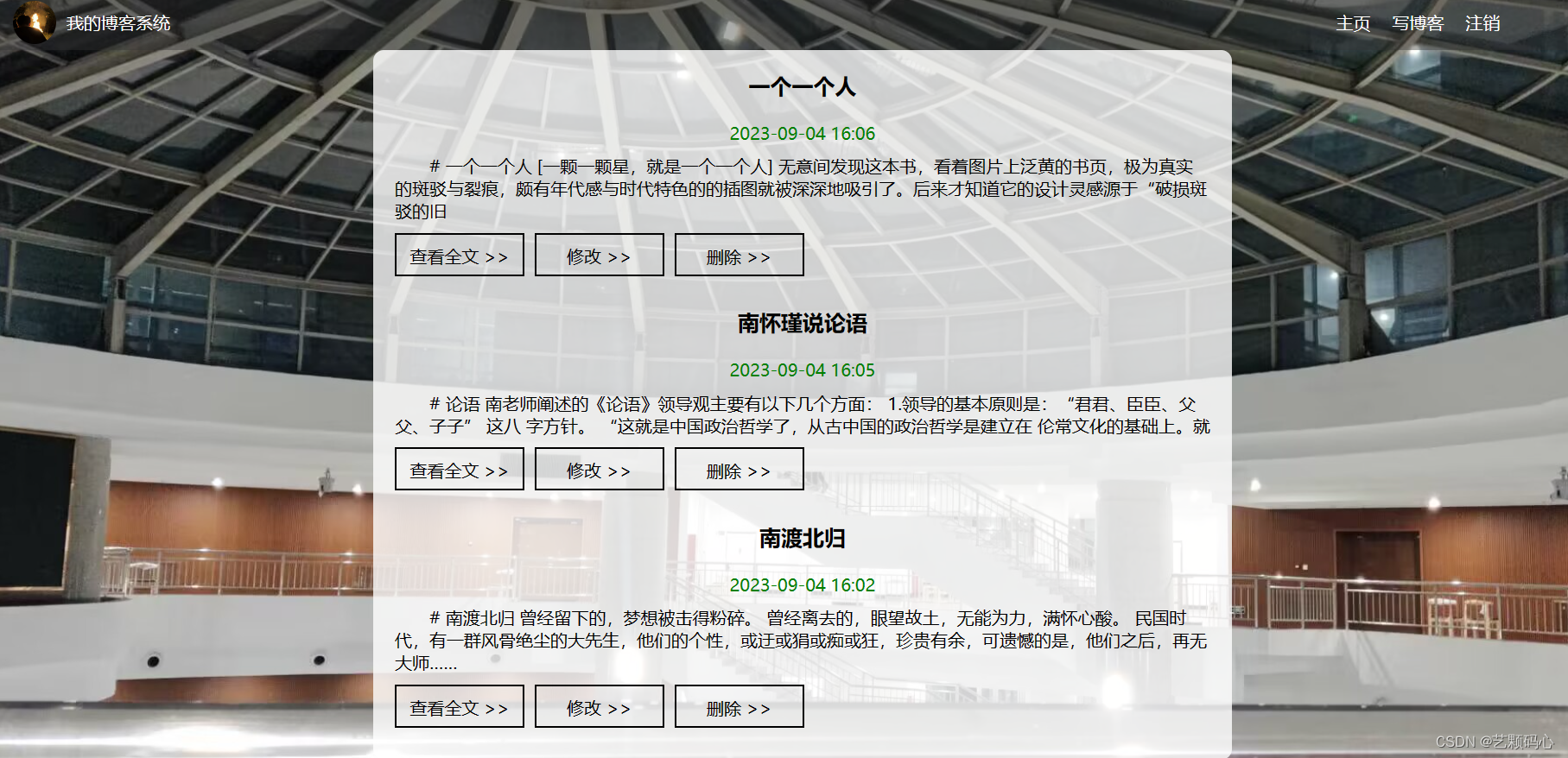 个人博客系统提供了 登录、注册、写博客&发布博客、删除博客、修改博客功能。前端的页面有 登录页、注册页、个人博客列表页、博客详情页、博客列表页(覆盖所有用户文章)。