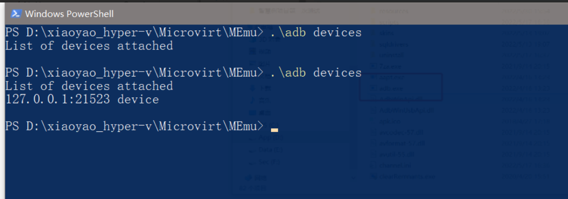 开启一个 cmd 或者 powershell,(我这里用的是 powershell,如果用 cmd 那么执行的命令去掉 .\ 即可)输入 .\adb devices,即可看见 adb 调试的端口 (记得先开启模拟器)