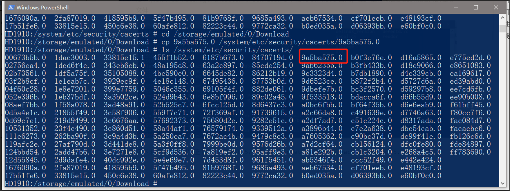 接下来移动(复制)证书,cp 9a5ba575.0 /system/etc/security/cacerts/9a5ba575.0