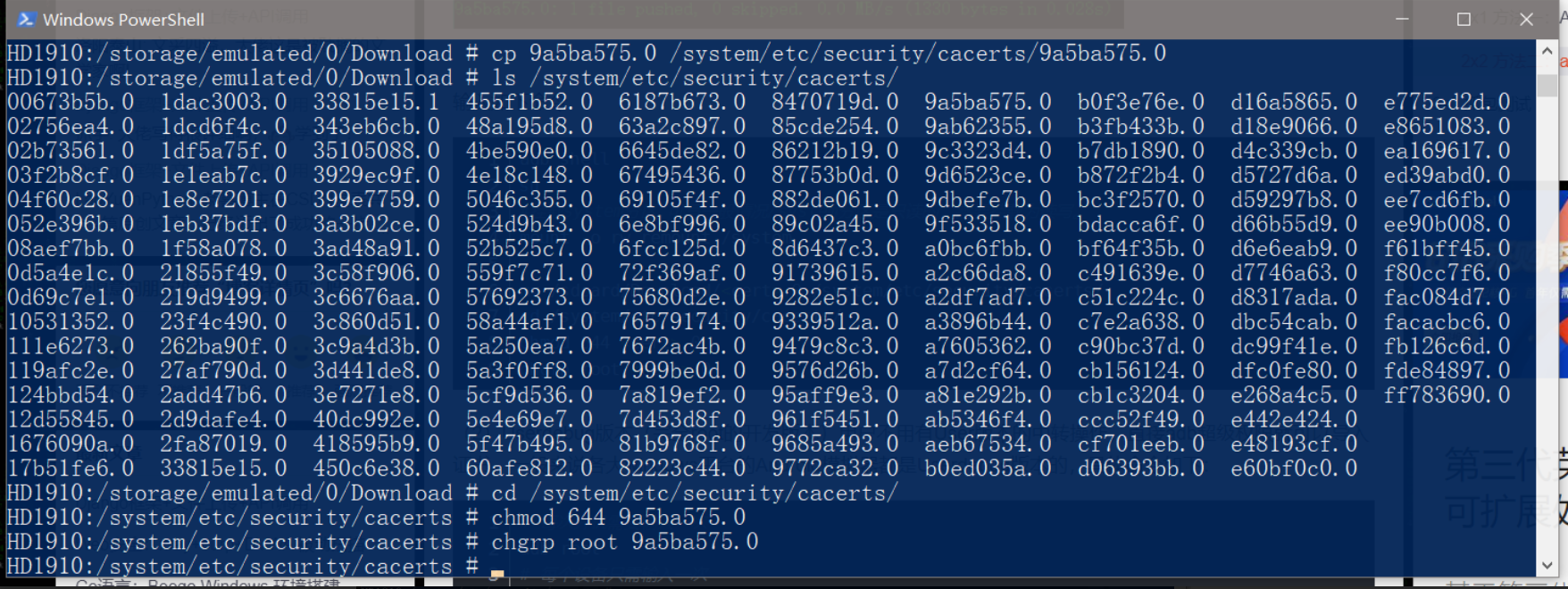 然后进入目录cd /system/etc/security/cacerts/,给予文件权限chmod 644 9a5ba575.0chgrp root 9a5ba575.0