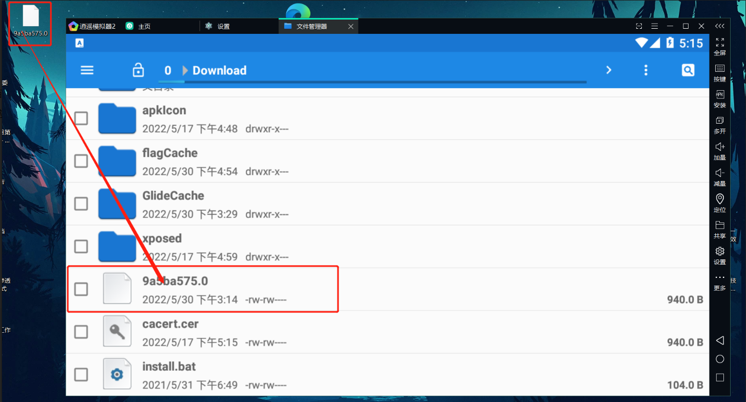将该文件拖放到模拟器中 (直接从 win 桌面拖到 模拟器桌面即可,系统会自动将文件放到 Download 目录下)