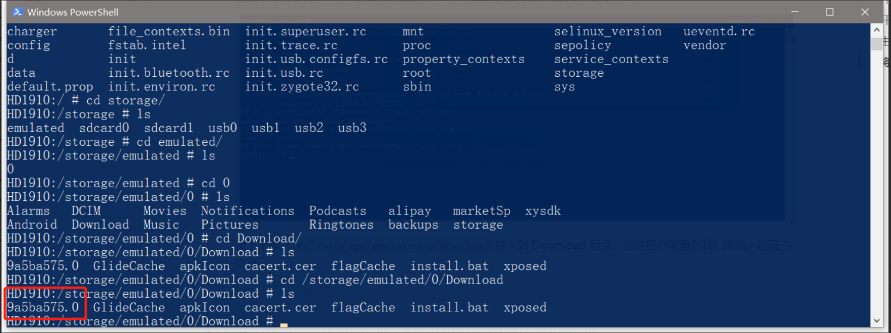 接下来输入cd /storage/emulated/0/Download进入到 Download 目录,在这里你能看到我们刚拖入的证书文件