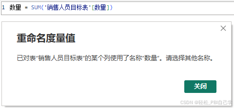 刚开始使用PowerBI的时候,总会遇到这样一个问题。表内有一列Sales,写个度量值,公式是SUM(表[Sales]),命名为Sales的时候,会跳出如下对话框。难道必须要去修改列名或者度量值名,给它们加上一些额外的看起来很奇怪的字符来区别吗?