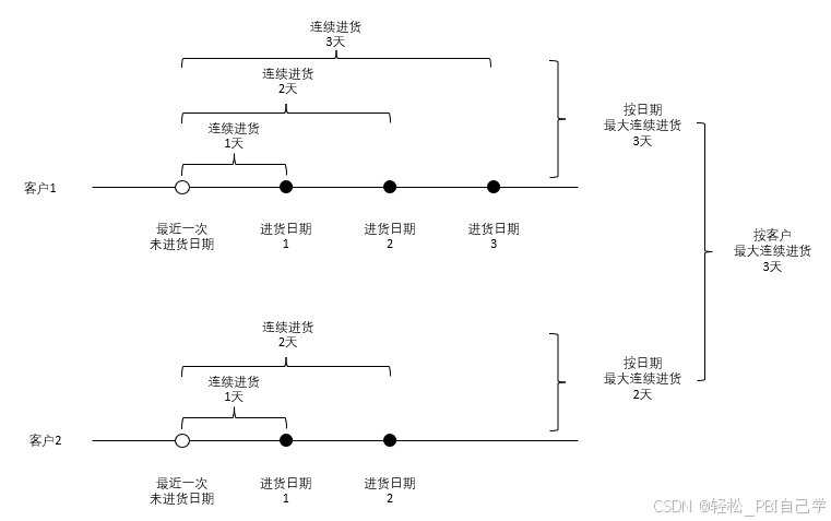 首先计算当前进货的最近一次未进货日期,然后用当前进货日期减去这个日期就得到连续进货天数了。有了连续进货天数,按日期可以得出最大连续进货天数,然后再按客户可以得出按客户的最大连续进货天数,最后取按客户的最大连续进货天数大于等于2的客户数就很容易了。