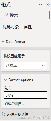 STEP 2 格式设置。视觉对象的格式设置,请不要直接在公式中使用FORMAT函数,这样会将结果转为文本。在格式窗格的属性中,Data format下“将设置应用于”选择达成率,输入需要显示的格式字符串。