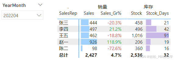 鉴于此,本文推荐一层表头用辅助表,二层表头用多个度量值,一层表头下如果有用不到的度量值,通过调整列宽隐藏(隐藏列也会占有细微的列宽,会让一层表头的分组间距变宽,因此度量值数量不宜超过10个)。这种方案,每个度量值可以单独设置格式,也可以单独设置条件格式(颜色、数据条等)。