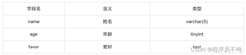 假设现在MySQL中有一张User表,含有三个阶段:姓名name、年龄age和爱好favor: