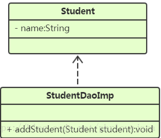 3、依赖关系(该类在某方法中使用到某类):类A指向类B的带箭头虚线表示
