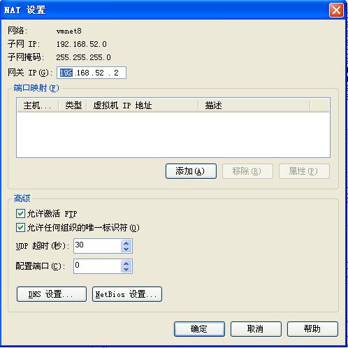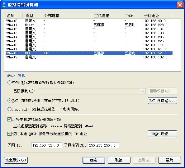 2) 选中列表中的“VMnet8 NAT”,点击左下角“恢复默认”按钮,恢复默认参数设置。然后点击“NAT设置”按钮,如下图: