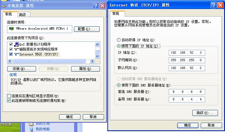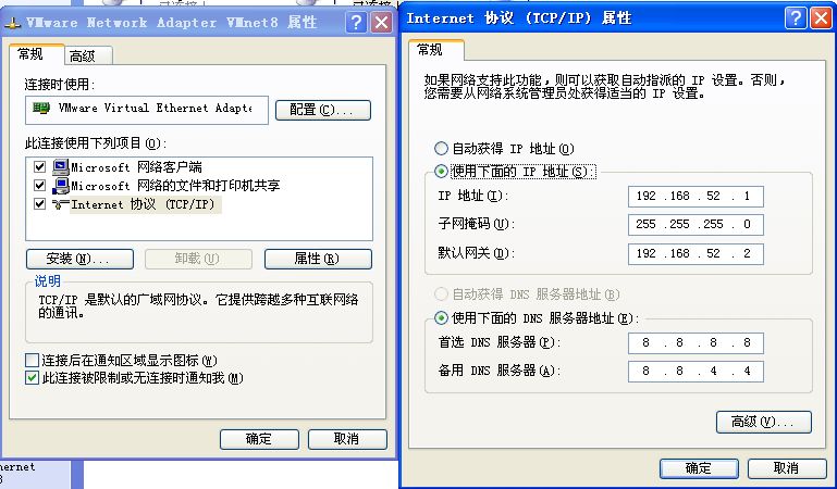 2) 设置物理主机的虚拟网络IP地址:192.168.52.X,X在0~255之间,但不可与上面的虚拟网络的子网IP重复。子网掩码、默认网关与上面获取到的虚拟网络的子网掩码、网关保持一致。DNS可设也不可忽略,如果设置,可利用google的免费DNS:8.8.8.8和8.8.4.4。