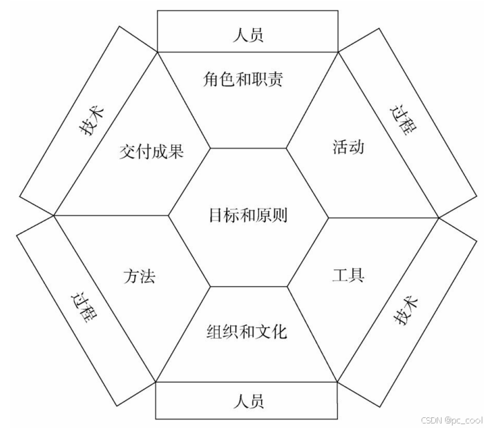 请牢记这个六边形所包含的内容:人员(角色和职责)、技术(交付成果和工具)、过程(方法和活动)。这些知识点在CDGA考试中比较容易被考到。