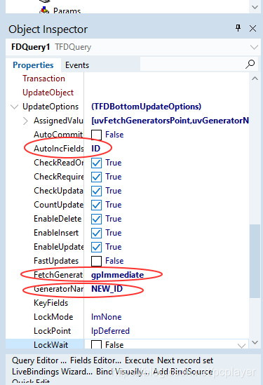 2. 选中这个 FDQuery1,在其属性面板里面找到 UpdateOptions 那一项,下拉开,找到里面的3个属性如图: