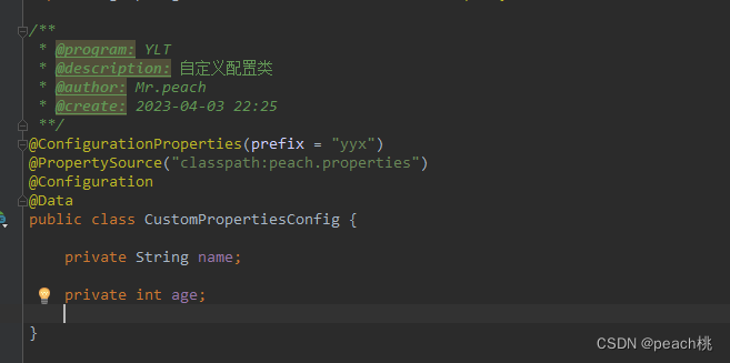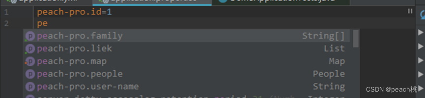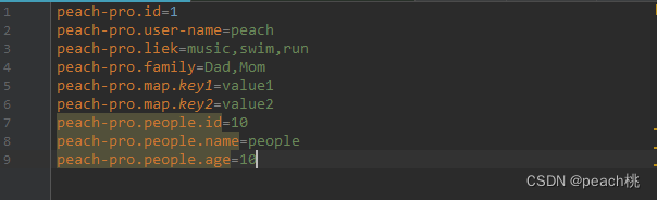 - 打开Spring Boot项目的resources目录,在项目的类路径下新建一个peach.properties自定义配置文件,在该配置文件中编写需要设置的配置属性。