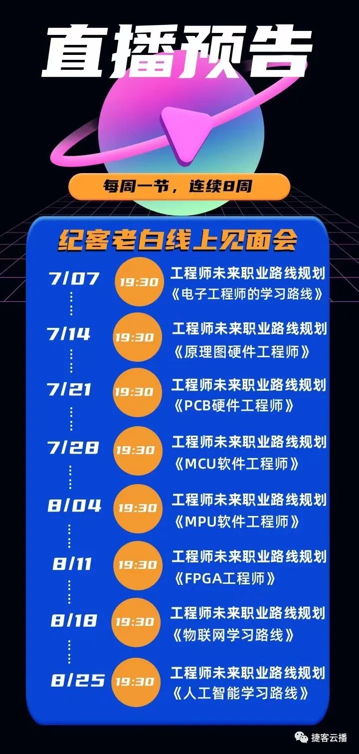 7月7日晚19:30,电子工程师白纪龙老师将在捷客直播首播,分享《电子工程师的学习路线—工程师未来职业路线规划》。内容涵盖硬件、软件学习路径,进阶方向,各阶段所需技能点及实战总结,为电子工程师的职业规划提供指导。