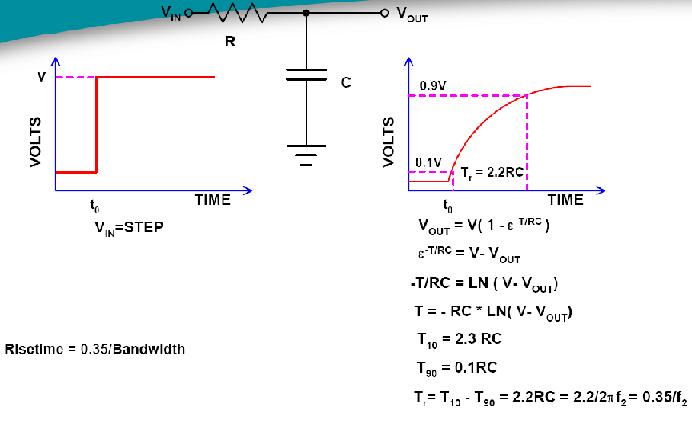 至此,我们知道带宽f2即输出电压降低到输入电压70.7%时的频率点。 根据放大器的等效模型,我们可进一步推导示波器的上升时间和带宽的关系式,即我们常提到的0.35的关系:上升时间=0.35/带宽,推导过程如下图6所 示。 需要说明的是,0.35是基于高斯响应的理论值,实际测量系统中这个数值往往介于0.35-0.45之间。在示波器的datasheet上都会标明“上升 时间”指标。 示波器测量出来的上升时间与真实的上升时间之间存在下面的关系式。 在对快沿信号测试中,需要通过该关系式来修正实际被测信号的上升时间。