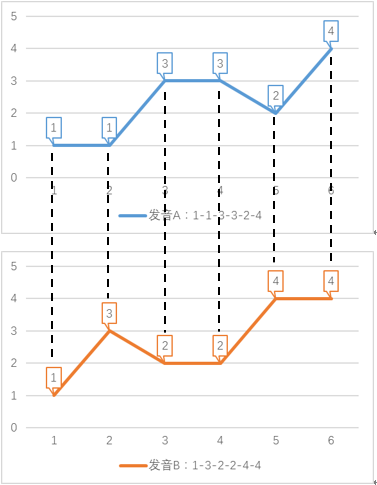 DTW(dynamic time warping) 最初用于识别语音的相似性。我们用数字表示音调高低,例如某个单词发音的音调为1-3-2-4。现在有两个人说这个单词,一个人在前半部分拖长,其发音为1-1-3-3-2-4;另一个人在后半部分拖长,其发音为1-3-2-2-4-4。