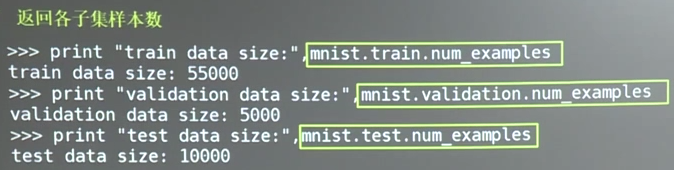 三、常用的操作 我们可以用mnist.train.num_examples、mnist.validation.num_examples、minst.test.num_examples三个分别打印出训练集、验证集、测试集所含有的样本数。