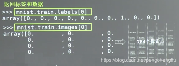 我们把784个像素点组成一个长度为784的一维数组,这个一维数据就是我们要喂入神经网络的输入特征。MNIST数据集还提供了每张图片对应的标签,以一个长度为10的一维数组给出。