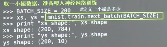 当定义好每轮输入的一小撮数据大小后(即BATCH_SIZE),可以使用mnist.train.next_batch(BATCH_SIZE)从训练集中随机抽取BATCH_SIZE组数据和标签,分别赋值给xs和ys。打印xs的形状,为200行,每行784个像素点,为输入的特征。打印ys的形状,为200行,每行10个数字。