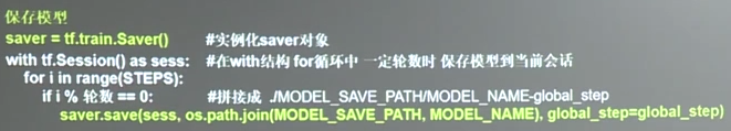 在反向传播中,如果想每隔一定轮数把模型保存下来,需要加上两句话。 首先是实例化saver对象。然后在with结构中,每隔一定轮数,把当前会话的参数等信息保存到MODEL_SAVE_PATH/MODEL_NAME这个路径,并在文件尾加上当前的训练轮数。