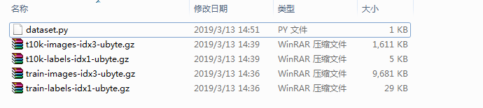 【注意】 有可能会报错,下不下来。那怎么办呢? 1.到下面这个网址,手动下载4个文件。 地址:http://yann.lecun.com/exdb/mnist/ 下载: 2. 将这4个压缩文件,放到与"dataset.py"同级的目录下: 其中,文件名叫"dataset.py",如果改成其他文件名,可能不行。比如我之前写了个"aaa.py"就不行,改成“dataset.py”就行。