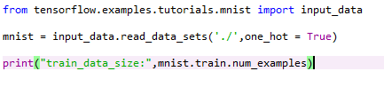 二、MNIST数据集下载 TensorFlow官方提供了input_data模块,input_data模块使用read_data_sets()函数自动加载数据集。函数第一个参数,是数据集存放路径。第二个参数one_hot=True表示以独热码的形式存取。 当函数运行时,会自动检查存放路径下是否有该数据集,如果没有,会自动下载MNIST数据集,并分为Train、Validation、Test三个子集。