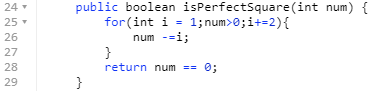【方法一】 由于1+3+5+7+9+…+(2n-1) = (1+(2n-1))/2 = n^2,即完全平方数n^2肯定等于前n个连续奇数的和。 所以可以利用这个特点进行判断。