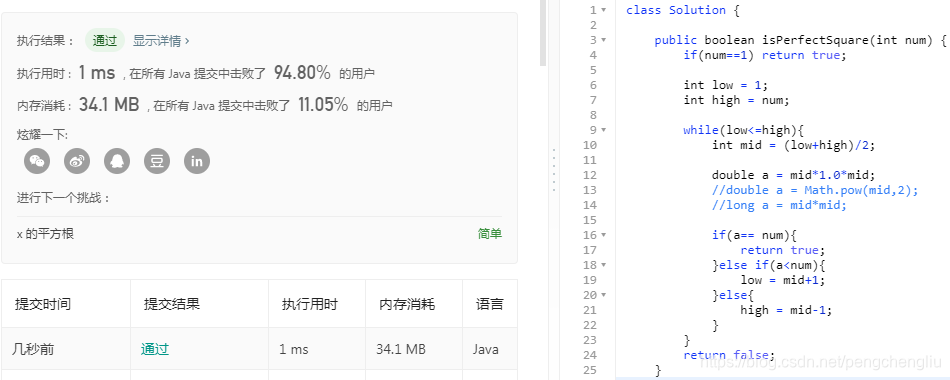 本文介绍并对比了两种判断一个数是否为完全平方数的方法:一是利用连续奇数和的特性,二是采用二分查找法。第一种方法基于数学公式1+3+5+...+(2n-1)=n^2,第二种方法通过二分查找提高效率。