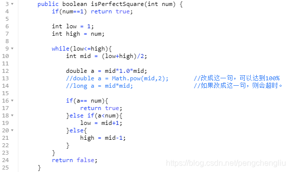 分析: 改成:long a = mid*mid,则会超时。使用mid*0.1*mid则可以,不知道有什么说法。