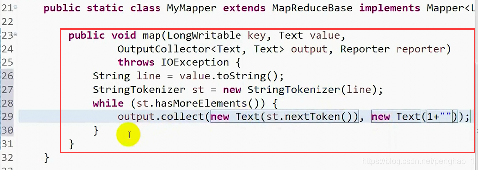 output.collect(new Text(st.nextToken()), new Text(1+""));