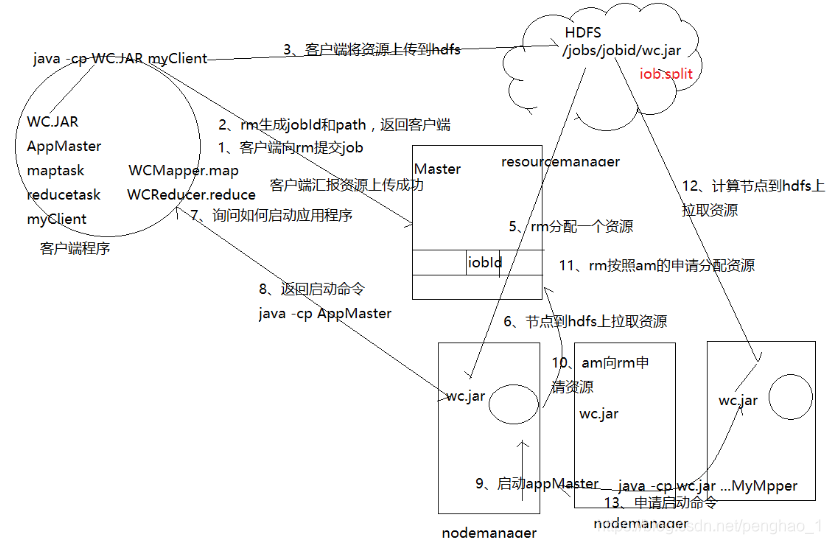 13、wc.jar需要向appMaster发送一个申请启动命令,同时计算直接在container上面进行计算,同时container是要向appmaster汇报执行的情况,他们是可以建立连接的。