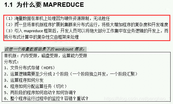 第一步在各个节点上是分成一个个小块进行存储,如果将计算的程序,也放到这些机器上来,就可以在机器上直接读取文件和计算,有多少个块,放多少个计算程序,每个计算程序是很小的,计算里面占用的空间是很小的,从计算来说是可以解决的,不会存在所谓的内存溢出问题,对于每一个块来说都是这种逻辑,将机器里面的每一个块里面总的数量都统计完了。