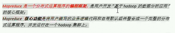 分布式离线计算框架,是分布式运算程序的编程模型,是用户基于hadoop的数据分析应用的核心框架,mapreduce的核心功能是将用户编写的业务逻辑代码和自带的默认的 组件整合到一个完整的分布式运算程序,并运行在hadoop集群上。