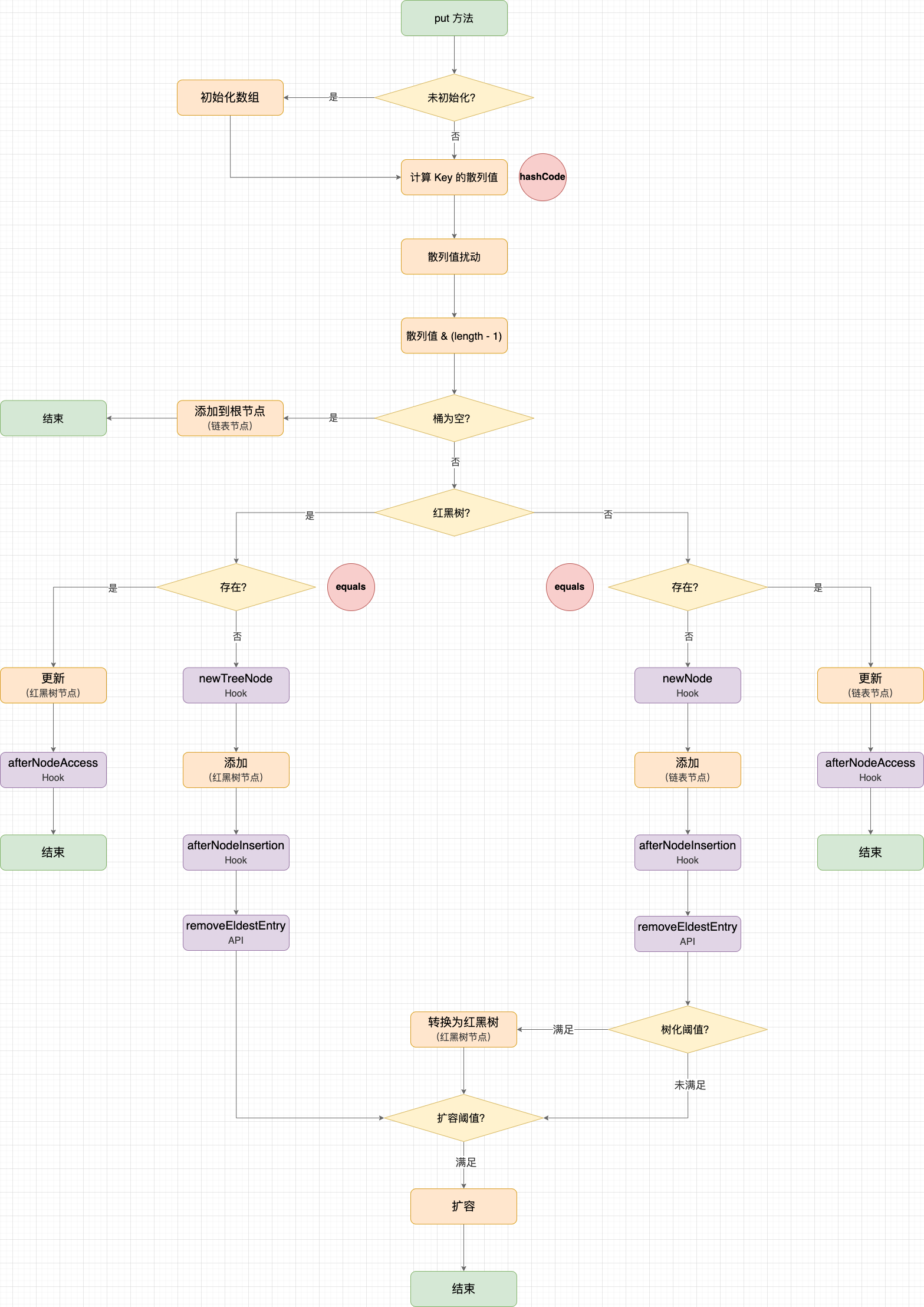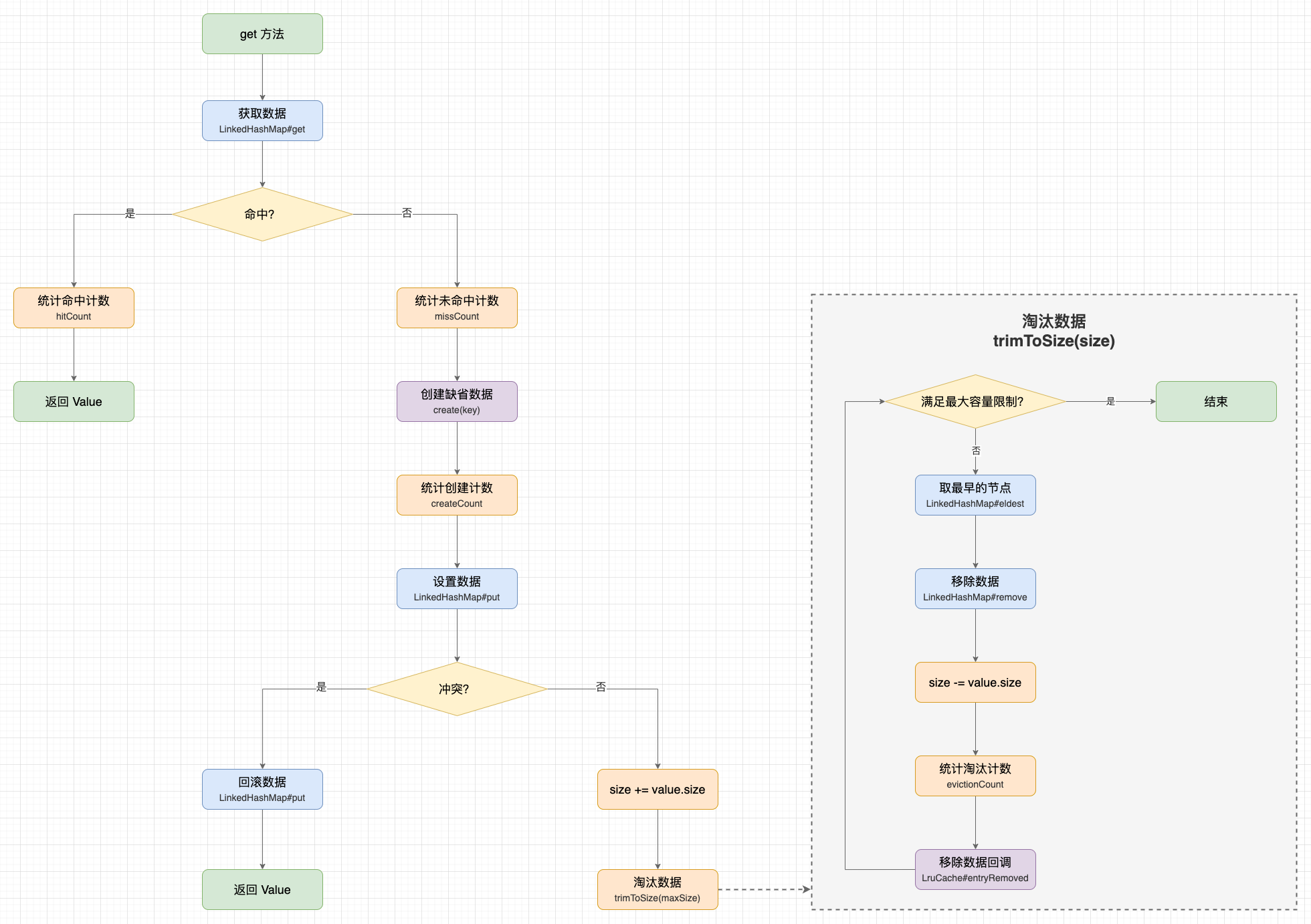 因此,在复用 LinkedHashMap 实现 LRU 内存缓存时,前文提到的 LinkedHashMap#removeEldestEntry() 淘汰判断接口可能就不够看了,因为它每次最多只能淘汰一个数据单元。这个问题,我们后文再看看 Android LruCache 是如何解决的。